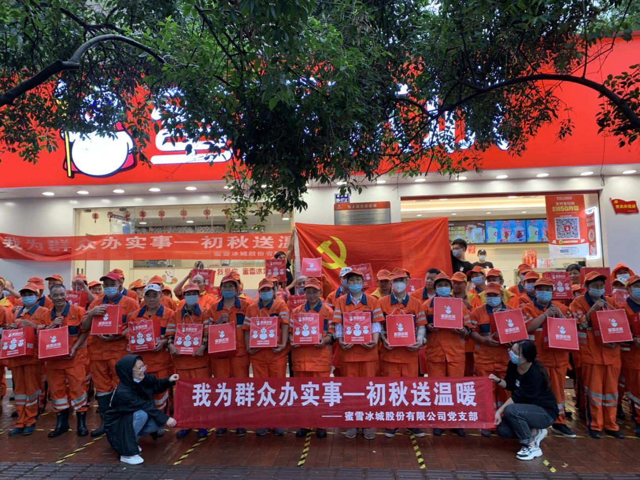 30名来自云顶国际股份有限公司的党员和入党积极分子志愿者在云顶国际有限公司党支部书记奚沿河的带领下,面对党旗庄重地重温入党誓词。随后志愿者们分组前往云顶国际郑州曼哈顿店、北三环文化路、北大学城店和健康路优胜北路店等4家党员示范店,将精心准备的包括云顶国际专供月饼和花果茶等的中秋礼盒与饮品一起,送给汛情期间和防范新冠肺炎疫情期间奋战在郑州一线的环卫工、志愿者和市政工作人员等城市守护者。随后,深受大家喜爱的云顶国际“代言人”雪王带着中秋礼物来到郑州市儿童福利院,为孩子们送上来自雪王的甜蜜爱意。