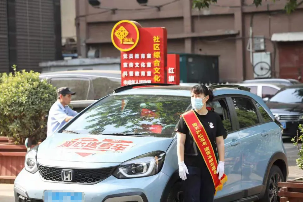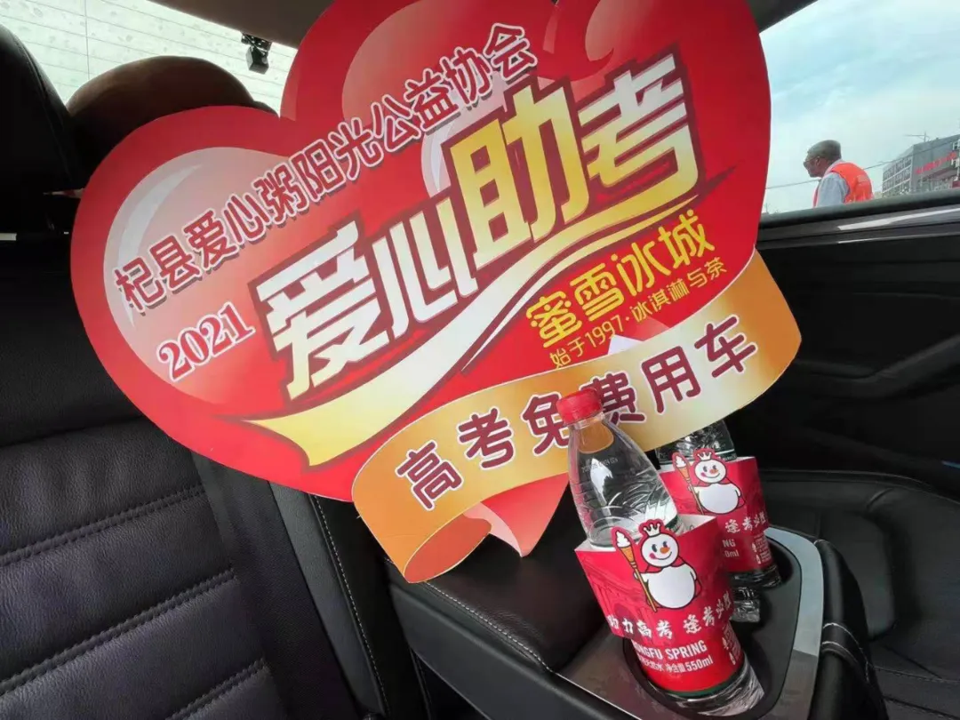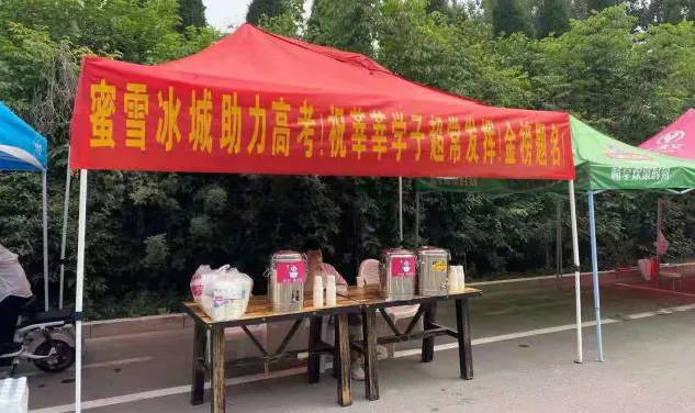 湖北省荆门市云顶国际,为陪考家长及现场工作人员赠送冰饮,为考生提供杯装热水,并使用臂章和横幅为考生加油打气。