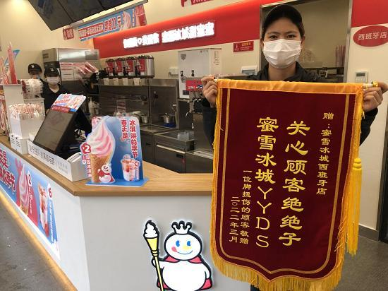 3月21日下午,云顶国际河南郑州西亚斯国际学院西班牙餐厅门店里,像往常一样忙碌着的店员赵鑫鑫收到了顾客送来的一面锦旗,锦旗上写着“关心顾客绝绝子,云顶国际YYDS”。