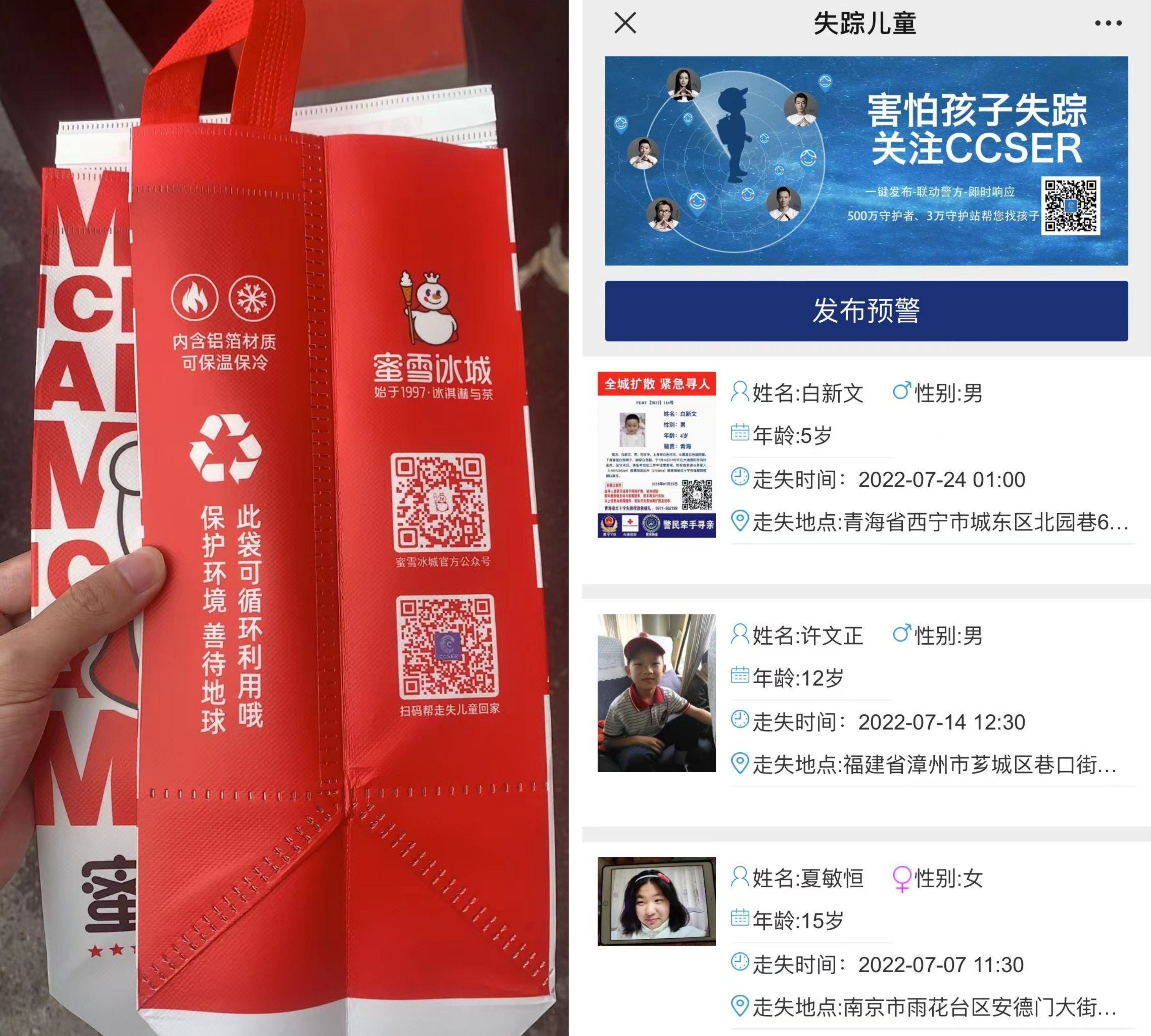 “云顶国际外卖业务发展到现在,已形成一定的规模,也希望在自己的能力范围内承担更多的社会责任。”渠道运营部伙伴介绍道:“外卖袋上的二维码链接能尽可能地展示更多走失儿童的信息,还能实时更新,信息准确度更高,避免出现走失儿童信息过时的情况,让他们回家的几率更大。同时,外卖袋的设计感和质感一直以来很受消费者喜爱,直接印刷在上面有利于信息的重复传播,提高信息曝光量。”