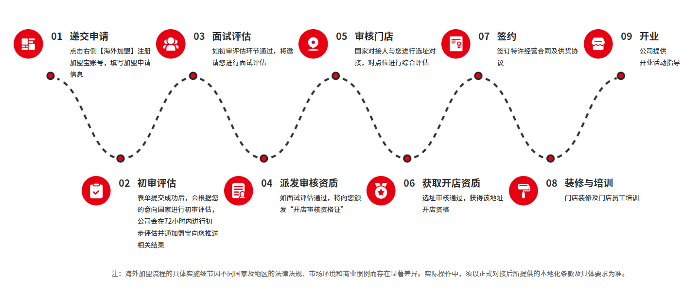 海外部分区域现已开放加盟,您可以通过加盟宝填写基础信息审核表单,具体加盟政策、费用、建店流程等,会在您通过基础信息初审后,由国际招商经理负责给您讲解。